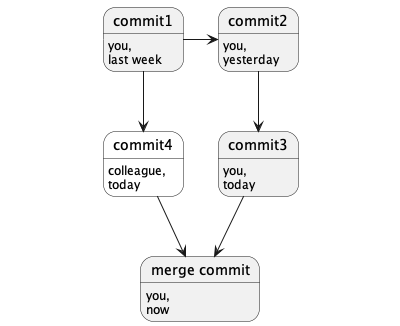 Finally, you ask Git to combine your work with the work of your colleague. Git creates a merge commit with two parents that combines the changes of both of you, as follows: