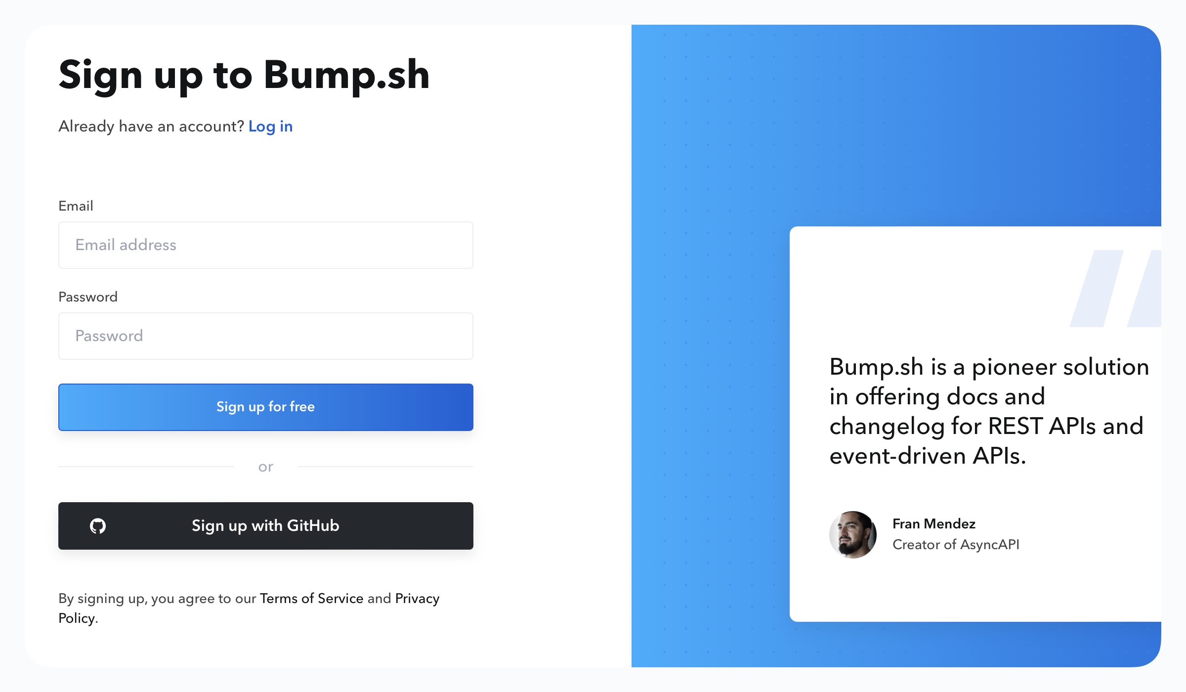 Publishing your first API documentation on Bump.sh will only take you a few moments. Creating an account, documentation, and uploading your first API definition can be done in just a few clicks.
