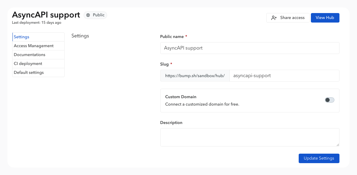 The slug directly affects the URL of your hubs and documentation. By default, it takes the name of your hub, but modifying it allows you to customize the URL.